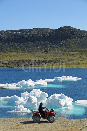 Man of the Inuit people riding a quad bike, ATM, parked on the shore of the Beaufort Sea, Arctic Ocean, Victoria Island, formerly Holman Island, village of Ulukhaktok, Northwest Territories, Canada