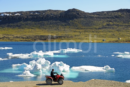 Man of the Inuit people riding a quad bike, ATM, parked on the shore of the Beaufort Sea, Arctic Ocean, Victoria Island, formerly Holman Island, village of Ulukhaktok, Northwest Territories, Canada