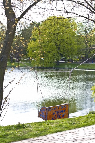 Germany, Schleswig-Holstein, Kiel, swing at lake with saying of Occupy