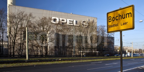 Opel Works, a place-name sign in the foreground, Bochum, Ruhr area, North Rhine-Westphalia, Germany
