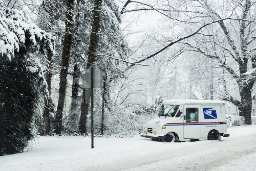 Mail delivery truck during a winter snow storm, New Jersey, USA