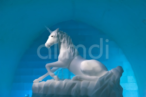 Ice art, unicorn, Jukkasjärvi Icehotel, Lapland, Norrbotten County, Sweden, Scandinavia