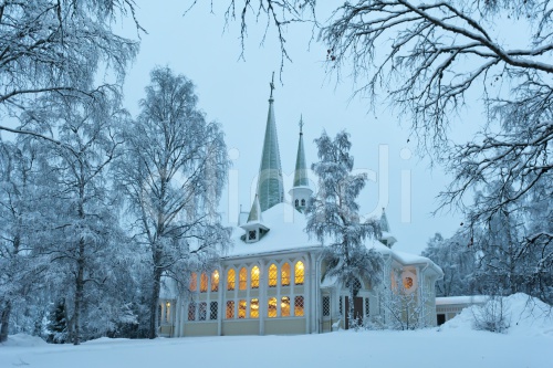 Church of Jokkmokk in the snow, Jokkmokk, Lapland, Norrbotten County, Sweden, Scandinavia