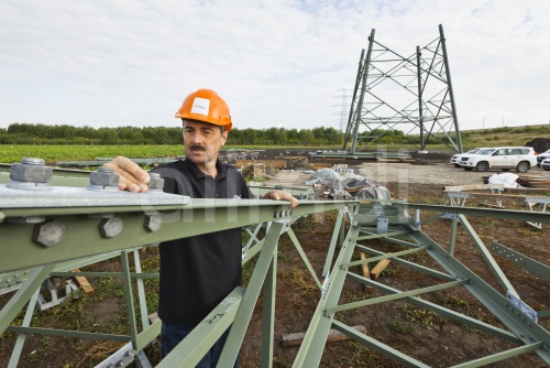 Engineer checking screw connections on segments of extra high-voltage pylons of a 380 kV extra-high voltage power line under construction, Wipfratal, Thuringia, Germany