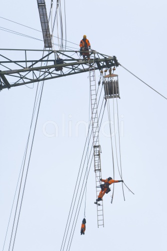 Overhead transmission cable installers installing insulated cable on the cross arm of a newly built high-voltage transmission mast, Mönchenholzhausen, Thuringia, Germany