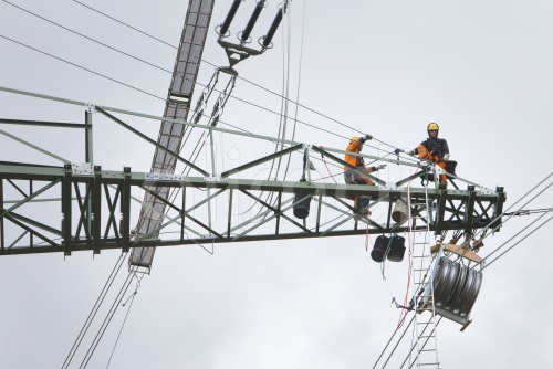 Overhead transmission cable installers installing insulated cable on the cross arm of a newly built high-voltage transmission mast, Mönchenholzhausen, Thuringia, Germany