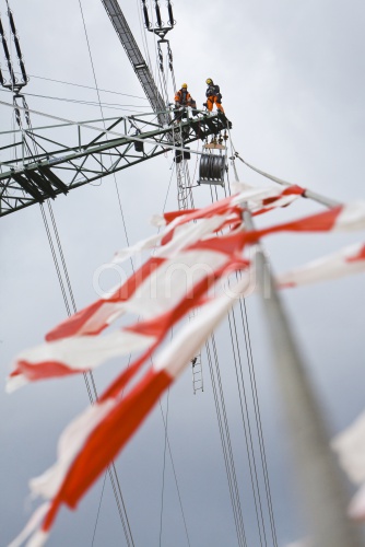 Overhead transmission cable installers installing insulated cable on the cross arm of a newly built high-voltage transmission mast, Mönchenholzhausen, Thuringia, Germany
