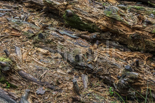 Decaying pine tree trunks left to rot on forest floor as dead wood, habitat for invertebrates, mosses and fungi