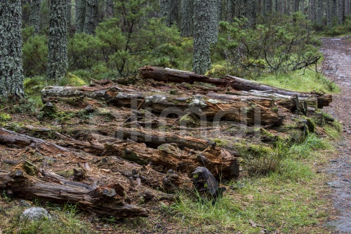 Pile of decaying pine tree trunks left to rot on forest floor as dead wood, habitat for invertebrates, mosses and fungi