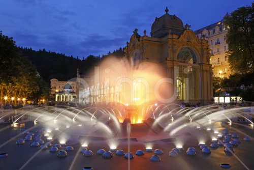 Evening mood, musical fountain, illuminated fountain with colonnade, new colonnade, Nová kolonáda, main colonnade, Marianske Lazne, Bohemia, Czech Republic