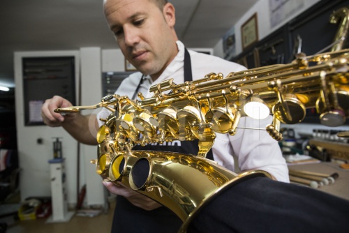 Instrument maker dismounting a saxophone during a repair