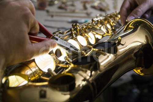 Instrument maker dismounting a saxophone using pliers during a repair