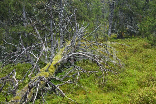 Fallen tree trunk covered in moss left to rot in old-growth forest / ancient woodland as dead wood, habitat for invertebrates, mosses and fungi