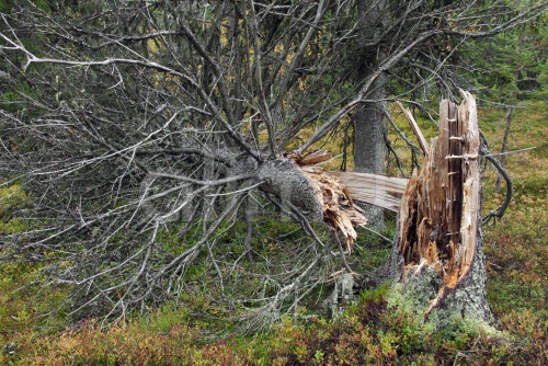 Broken pine tree trunk left to rot in old-growth forest / ancient woodland as dead wood, habitat for invertebrates, mosses and fungi