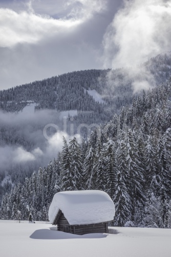 Wooden hut covered with a lot of snow, Obertilliach, Lesachtal valley, East Tyrol, Austria