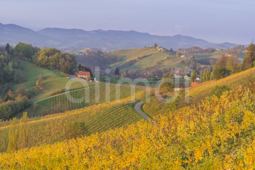 Autumnal vineyards and farmhouses in the morning light, Ratsch an der Weinstraße, Styria, Austria