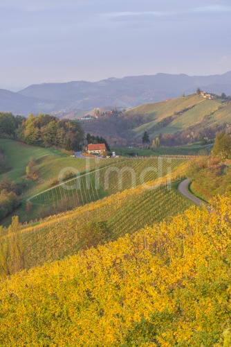 Autumnal vineyards and farmhouses in the morning light, Ratsch an der Weinstraße, Styria, Austria