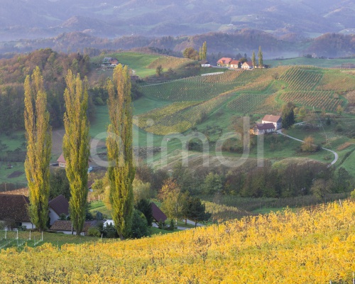 Autumnal vineyards and farmhouses in the morning light, Ratsch an der Weinstraße, Styria, Austria