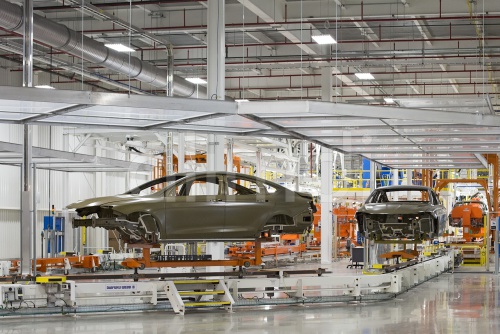 Car bodies move along a conveyor in the paint shop at Chrysler's Sterling Heights Assembly Plant which produces the Chrysler 200, Sterling Heights, Michigan, United States