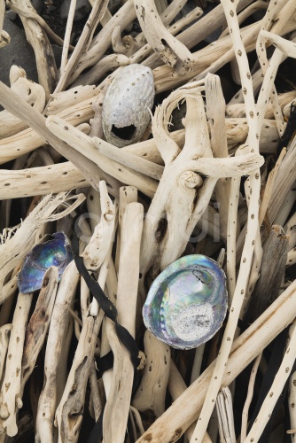 New Zealand, Driftwood and Paua Shells, Haliotis iris, on beach, close-up