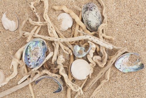 New Zealand, Driftwood, Paua Shells, Ringed Dosinia, Dosinia anus, on sandy beach
