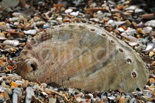 Abalone / Common ormer / Lamellose ormer (Haliotis lamellosa) shell on beach, Mediterranean, France
