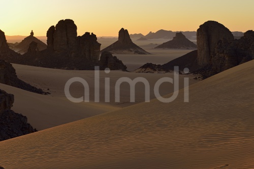 Africa, Algeria, Sahara, Tassili N'Ajjer National Park, Sunset over Timghas