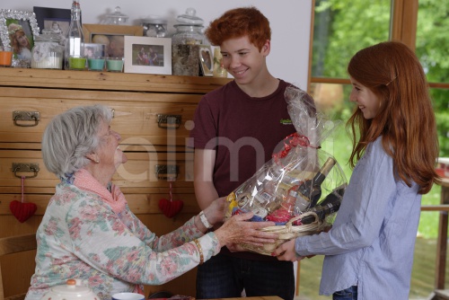 Birthday party, grandchildren congratulating their grandmother with a gift basket, Bavaria, Germany