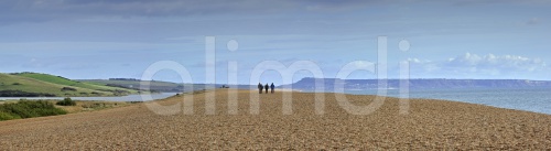 Fleet Lagoon at Abbotsbury and tourists walking on Chesil Beach tombolo, one of three major shingle structures in Britain along the Jurassic Coast, Dorset, southern England, UK