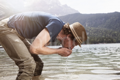 Germany, Bavaria, Eibsee, man drinking water from lake