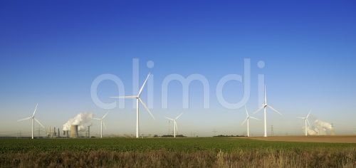 Germany, North Rhine-Westphalia, Neurath, Wind wheels and mining power plant