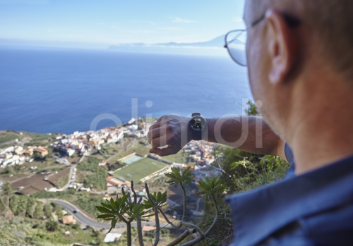 Spain, Canary Islands, La Gomera, hiker looking at smartwatch