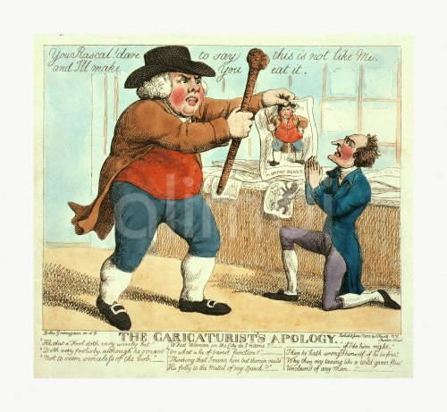 The caricaturist's apology, Grinagain, Giles, pseud. , artist, London, 1802, Large man holding a club and caricature of himself, threatens a kneeling caricaturist.
