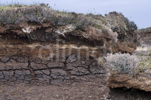Peat hag showing exposed layers of turf, decayed vegetation, by erosion in bog moorland, Scotland, UK