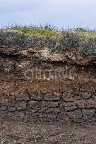 Peat hag showing exposed layers of turf, decayed vegetation, by erosion in bog moorland, Scotland, UK