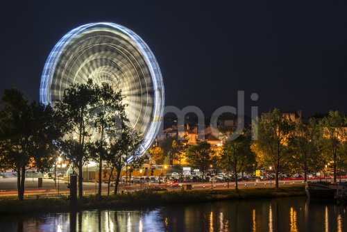 Motion blurred Ferris wheel at night along the Rhone river in the city Avignon, Vaucluse, Provence-Alpes-Côte d'Azur, France