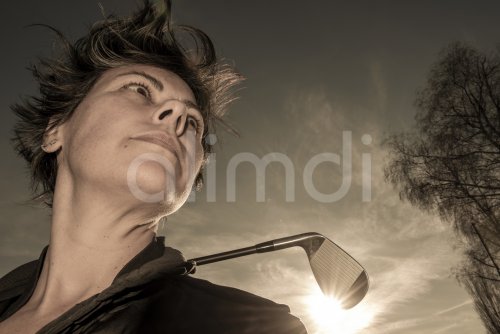 Golfer Leaning Her Golf Club on Her Shoulders with Sunlight.