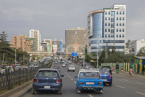 Cars driving on busy road in the city Addis Ababa / Addis Abeba, Oromia Region, Ethiopia, Africa