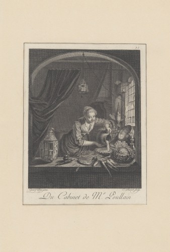Milkmaid after the painting of G. Dou in the Cabinet of Mr. Poullain, mid-17th century, Engraving, Plate: 6 5/16 x 4 15/16 in. (16 x 12. 5 cm), Prints, After Gerrit Dou (Dutch, Leiden 1613–1675 Leiden), Charles François Adrien Macret (French, Abbeville 1751–1789 Paris), This modest print records Dou's painting shortly after 1780, when it was sold from the Poulain collection in Paris. As in similar scenes invented by Dou during the 1640s and 1650s, the pretty kitchen maid is surrounded by motifs that had for decades stood for male and female private parts